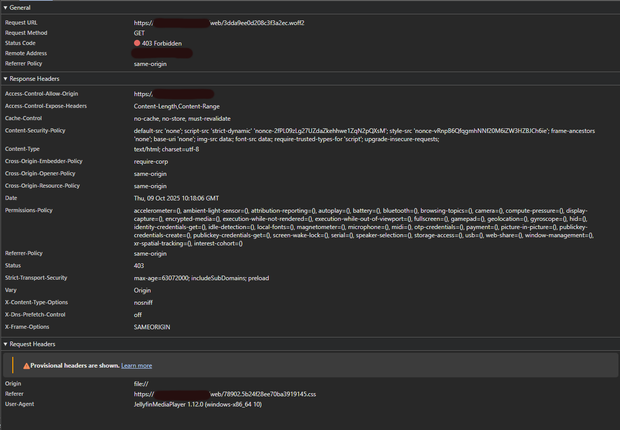 CORS Issues - Desktop Windows - Royal_Guard - 2025-10-09 Hi, I've noticed that the desktop app is sending some requests with "file /" as the Origin.This happens for the websocket (so syncplay doesn't work), and the font files (unless I use a custom theme that uses external ones). The web app and everything else requests stuff with the correct Origin. I can fix this by disabling CORS, but that isn't ideal for outside access. I don't know if this could help, but here's the CSP directive for the reverse proxy (there's a lot of stuff for external stuff like ElegantFin and Editor's Choice. If I disable those the problem doesn't go away) : Code: default-src 'self'; script-src 'self' 'unsafe-inline' wasm-unsafe-eval blob: https://www.gstatic.com https://www.youtube.com blob: https://cdn.jsdelivr.net/npm/@splidejs/splide@4.1.4/dist/js/splide.min.js; style-src 'self' 'unsafe-inline' https://cdn.jsdelivr.net https://fonts.googleapis.com; font-src 'self' https://fonts.gstatic.com; img-src 'self' data: https: blob:; connect-src 'self' https://cdn.jsdelivr.net/npm/@splidejs/splide@4.1.4/dist/js/splide.min.js.map; media-src 'self' blob:; object-src 'none'; base-uri 'self'; form-action 'self';I'll attach the Headers as images. I've installed Jellyfin with this script. I'm running Jellyfin on a Proxmox Unpriviledge Container (LXC) that has Ubuntu 24.04.3 LTS on it. I've syslinked /usr/share/jellyfin/web to /var/lib/jellyfin/wwwroot since it was giving out a warning on the logs. The logs show basically nothing, the only things that it showed were fixed about 5 minutes ago (the warn for wwwroot missing and a perms issue on usr/share/jellyfin/index.html) Thanks a lot and I hope I can fix this simple issue. |