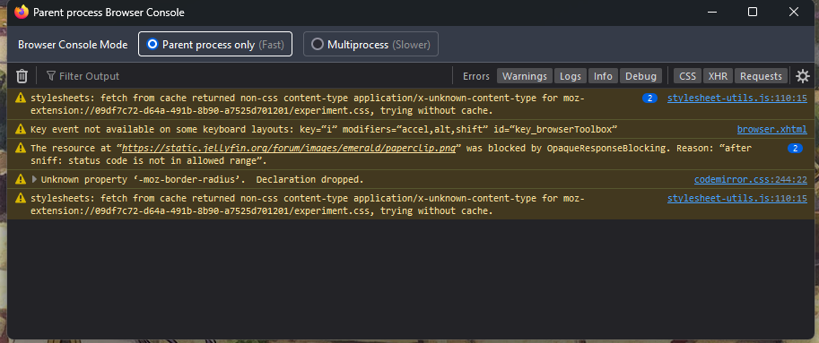 RE: PC Video Playing Issue - TheDreadPirate - 2024-05-27 That log is still showing a clean ffmpeg run. Which client are you using on your PC? Looks like a browser. Which one? Can you open the developer console in the browser, replicate the problem, and then report any thing you see in the developer console. RE: PC Video Playing Issue - Roguediculous - 2024-05-28 (2024-05-27, 11:20 PM)TheDreadPirate Wrote: That log is still showing a clean ffmpeg run. Here is a screenshot not sure if thats what your asking for? The version of Jellyfin you are running (e.g. 10.8.10) 9.3.3 - Ubuntu Proxmox Container, and this only happens in the web browser but I am unsure of the desktop application. However it does work on my android tvs application without fail. I have tried Edge / FireFox RE: PC Video Playing Issue - TheDreadPirate - 2024-05-28 Can you make a backup of your Jellyfin data and try upgrading to at least 10.8.13? I vaguely recall there being quite a few jellyfin-web bugs resembling this. RE: PC Video Playing Issue - Roguediculous - 2024-05-29 (2024-05-28, 01:16 PM)TheDreadPirate Wrote: Can you make a backup of your Jellyfin data and try upgrading to at least 10.8.13? I vaguely recall there being quite a few jellyfin-web bugs resembling this. Not sure where I came up with 9.3.3 but its actually 10.9.3 build on both the server and web application. I think I was just going crazy yesterday, new day same problem though.