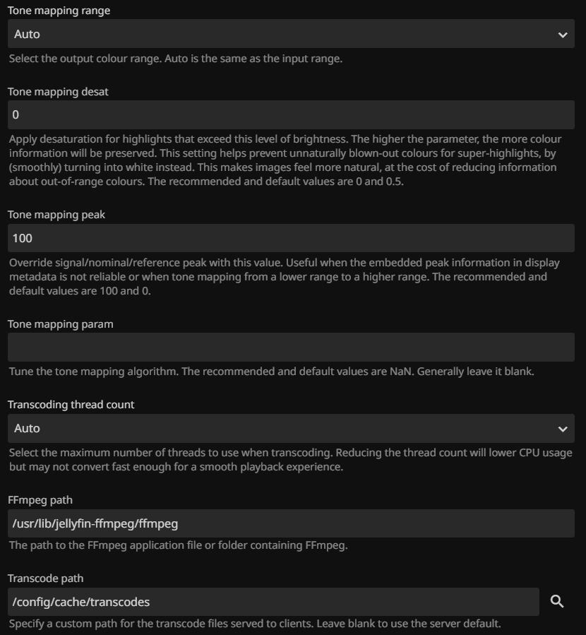 Android mobile app errors when transcoding - Tremmert - 2024-08-23 Hi all, I have a weird type of an issue. I'm using Jellyfin which is hosted on an Unraid server. On PC, I am using a Jellyfin Desktop App to watch my media. Watching media using a web browser works as well. However, when I attempt to use my Android phone, with the latest Jellyfin from the Apps Store, the media doesn't run unless it's DirectStream. Since most of the media has to be transcoded onto my phone, the mobile app just throws a Fatal Error on it. However, if I use the same phone and open a web browser (in this case, Brave), then the same media works just fine and transcoding works without an issue. I'll provide debug logs of both working and non-working scenarios. I anonymized my server and IP details, everything else has been left untouched. Working logs using mobile web browser: -snip- -snip- Non-working logs using mobile Jellyfin app: -snip- -snip- Jellyfin mobile app is connected to the same domain as the one I type into the web browser. I've tried uninstalling, clearing all data and cache and reinstalling - however, no success. Any ideas as to why this occurs? Thank you in advance. Edit: Forgot to mention, using Jellyfin server version 10.9.8 RE: Android mobile app errors when transcoding - TheDreadPirate - 2024-08-23 The one that is working is only transcoding the audio. The one that isn't working is attempting to transcode the video, but no GPU was available. What are your hardware specs, did you pass the GPU into the container, can you share screenshots of Dashboard > Playback in the Jellyfin UI. RE: Android mobile app errors when transcoding - Tremmert - 2024-08-23 Thanks for responding, My mistake for not providing more hardware information originally. I do not have a GPU, it's a dedicated server with a ton of RAM & storage, and I'm utilizing QSV; CPU: 13th Gen Intel® Core™ i5-13500 - specifically picked a stronger CPU so it should have no issues with transcoding using Intel QuickSync Dashboard pics below: I've mostly left everything default except for the first part. RE: Android mobile app errors when transcoding - TheDreadPirate - 2024-08-23 The iGPU on the CPU is the part with Intel Quick Sync and that still requires you to pass that GPU into the container. Stop the container in unRAID. Open the docker config for the container. Go to the bottom and click on "Add path, port, variable, label, or device". Add a device and in the box enter "/dev/dri/renderD128". Save. Start the container. In Jellyfin, go back to Dashboard > Playback. You can check "Enable encoding in HEVC format" as well as both tone mapping check boxes. I'd also recommend checking "Throttle transcodes" and "Delete segments". RE: Android mobile app errors when transcoding - Tremmert - 2024-08-23 That works perfectly, thank you! Had absolutely no idea I also had to pass renderD128 as a Device as well. Checked all of the boxes per your recommendation as well. This can be closed, thank you again! |