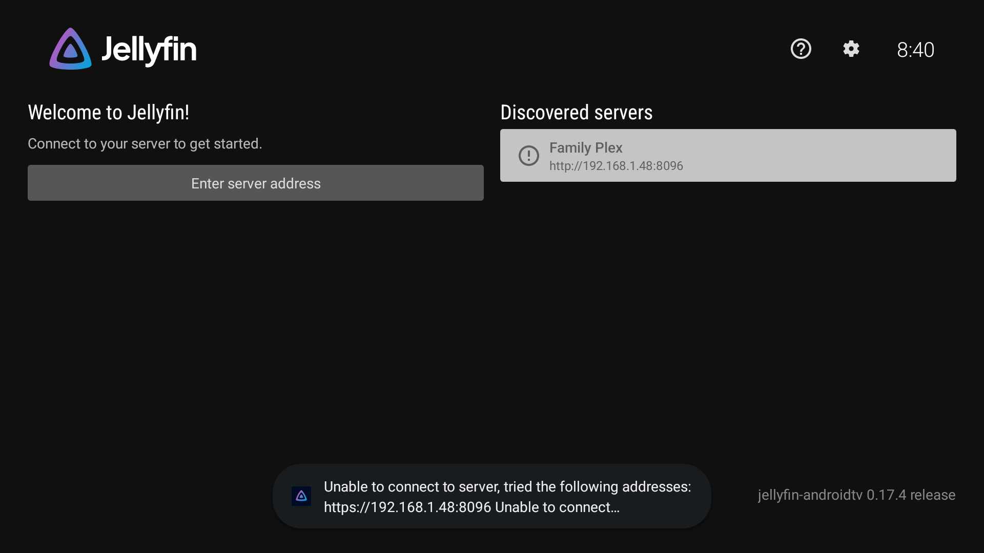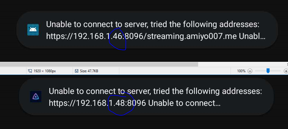 Unable to connect to server - Abrar Jahin Amiyo - 2024-09-03 Whenever I try to connect any local device to my jellyfin server, it says, "Unable to connect to server." I am not a network expert, being a basic user please tell me how can I fix this. The problem started since I updated my server to 10.9.9. Till then, it was working fine. RE: Unable to connect to server - Efficient_Good_5784 - 2024-09-03 Can you share your server logs? Also please share what clients and how you're attempting to connect to the server. RE: Unable to connect to server - Abrar Jahin Amiyo - 2024-09-03 Can you plz tell me how to do that? RE: Unable to connect to server - TheDreadPirate - 2024-09-03 Try clearing your browser cache. There was a big change in the way Jellyfin caches data in your browser starting with 10.9.9. RE: Unable to connect to server - Abrar Jahin Amiyo - 2024-09-03 This is still happening even after clearing cache RE: Unable to connect to server - TheDreadPirate - 2024-09-03 Remove all the stuff at the end of the URL. http://192.168.1.46:8096/ RE: Unable to connect to server - Abrar Jahin Amiyo - 2024-09-03 Still not working RE: Unable to connect to server - TheDreadPirate - 2024-09-03 The address in that screenshot is different. In the first screenshot it was .46. In your latest screenshot it is .48. RE: Unable to connect to server - Abrar Jahin Amiyo - 2024-09-03 But the server is same. I have no idea why it is happening. Do u have any other solution? RE: Unable to connect to server - TheDreadPirate - 2024-09-03 I'm asking which IP is correct? Did you mistype the address? You used two different IP addresses. Which one is correct? |