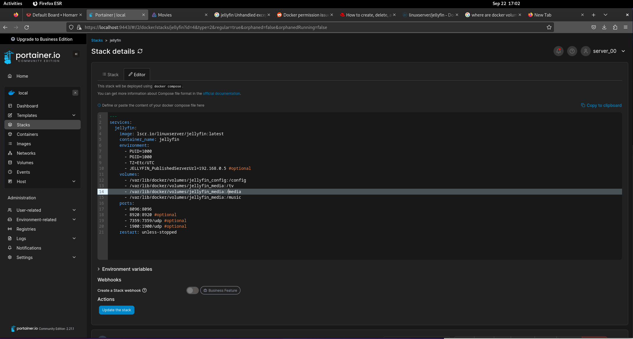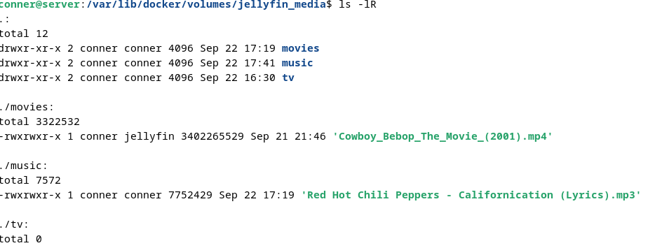 Media Identification - akon718 - 2024-09-22 I recently set up Jellyfin through portainer. I have the service running but it does not seem to recognize the media I am putting into it. I have researched a lot about this issue and I have tried my best to update file permission/ownership but nothing seems to work. Attached are photos showing the issue I am having.[attachment=5005][attachment=5005] RE: Media Identification - Efficient_Good_5784 - 2024-09-22 You're not mounting the volumes correctly. You're missing the whole ": /config" part as an example. Here's an example of how you're supposed to format those volume lines: Code: volumes:RE: Media Identification - akon718 - 2024-09-22 I see what you're saying. I set up a volume in docker where I am going to store my data called "Jellyfin" From there I went into the Volume I created and made the movies/shows/music files I want Jellyfin to access. I made sure to chmod them to 775. I then took your above advice and changed my portainer stack to match what you posted above. Then in my jellyfin settings I remapped my volumes to match what I added. When I was putting them in they only allowed me to select from /movies,/music,etc. (and not the full filepath) so I figured that waas a good sign. I then added a movie, this time just giving it 777 perms for good measure in hopes it would work But the movie does not show up. I manually scanned all my libraries in the dashboard and it did not work. Thank you for your help on the above post though. I would greatly greatly appreciate if you could help me sort this out. RE: Media Identification - theguymadmax - 2024-09-22 Give this guide a look through, especially this part: "the most common things I see is some variation of "I ran 'chmod 777' on my library and Jellyfin still can't see my files". And that is rooted in a fundamental misunderstanding of Linux permission concepts. Specifically the concept that for a user to be able to access a particular file they need permission to navigate through every single folder leading to the file." RE: Media Identification - akon718 - 2024-09-22 considering i set the full filepath to 775 i dont think this is a problem with linux file permissions. I have a base understanding of file permissions what i dont have is an understanding of how docker/jellyfin interacts with the file system. I know 777 only gives write permissions to all users compared to 775 but at this point im just throwing darts at a dart board and hoping something sticks. RE: Media Identification - TheDreadPirate - 2024-09-22 Why is everything in /var/lib/docker? Did you put your movies and other media in that directory? Move your content to /media on the host. Much shallower directory structure and you don't have to fight with permissions and, possibly, ACLs as much. RE: Media Identification - akon718 - 2024-09-22 I have everything in /var/lib/docker because i was (and am) under the impression that for a docker container to access files stored on your pc they need to be in a docker volume. I created a docker volume called jellyfin_media and jellyfin_config as to my understanding thats how I would let jellyfin access my files through the container. in my mind the volume syntax goes [path to the docker volume you want to store your files in on your host pc]:[path to where those files will be stored inside the container] so i set mine up as /var/lib/docker/volumes/jellyfin_media : /media I tried to do what you just said and put my files into the media folder in my root dir as well as in a media file in my home dir and neither of these worked because i dont know what the sytax for the volume would be. I tried to do /home/conner/media/movies: /movies but that did not populate jellyfin with anything. If I go into the container console I can see the directories I made but they are completely empty EDIT: Something interesting I found while going through my container file system, there is a music, tv, and media folder in the root driver and each of them have a tv, movies, music dir inside of them. Im not sure at all why thats the case but it might hint at where im messing up in terms of volume configuration EDITx2: I realised that in my compose i accidentally put mdeia insead of movies and it seemed like all 3 of those volumes that I made are updating on my host machine with the tv, movies, and music dirs except that theyre empty and dont have the movies/music I put into them (also i did not mean to mark this as solution and I dont know how to unmark it as solution) RE: Media Identification - akon718 - 2024-09-22 This is as close as Ive gotten, I put music, movies, and tv into a folder in the container called media. I then mapped the individual host pc dirs to the containers dirs so they dont all populate with movies,tv, and music. That being said the files I put into those folders do not appear. I hope ive narrowed down the problem enough for you guys to assist, i am trying my best to self diagnose RE: Media Identification - theguymadmax - 2024-09-22 Your file permissions are incorrect; the owner and group shouldn't be set to root. As mentioned earlier, please follow this guide. RE: Media Identification - akon718 - 2024-09-22 the screenshot youre refrencing is the console of the container not my host pc. they are root because the container does not have any other users besides root. Attached is a screenshot of the file permission of the files themselves. One of them has my user as group and the other has jellyfin as group to test both even though since I sed PUID and PGID to 1000 1000 they should both be my user. Neither of them show up. |