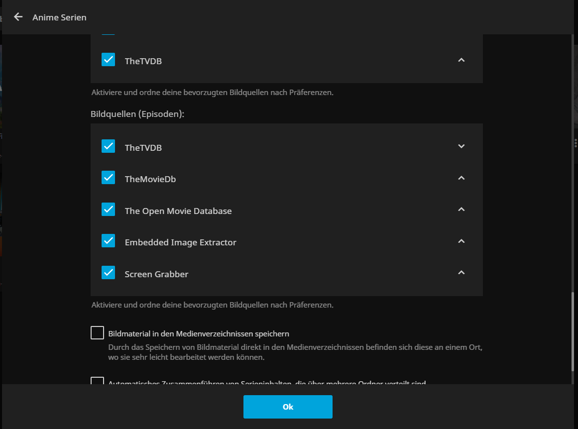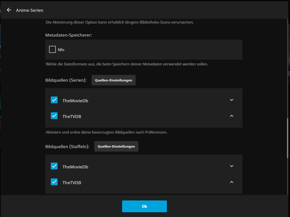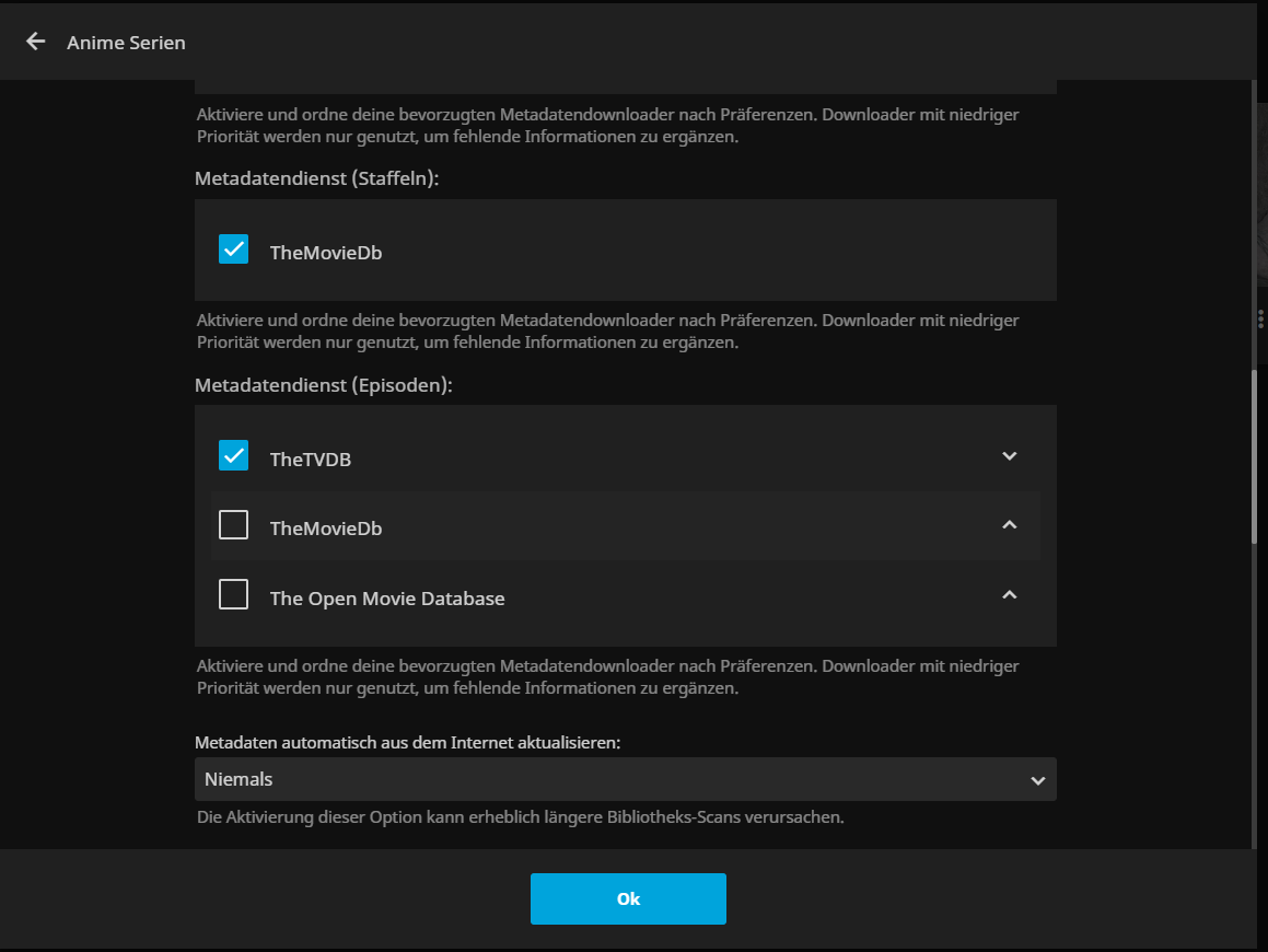 Problem with Metadata in Special episodes - Hallo123 - 2024-11-10 I have the problem that in "Sword Art Online" S00E28 and in "That time I got reincarnated as a Slime" S00E09 - S00E12 the metadata is not taken correctly, but is not displayed at all or is displayed for the wrong episode I use TheTVdb for Metadata The Episodes named correctly RE: Problem with Metadata in Special episodes - TheDreadPirate - 2024-11-10 What metadata is it pulling down? Can you provide the full path for the SAO special in question? And show me screenshots of the metadata provider ordering in the library settings? RE: Problem with Metadata in Special episodes - Hallo123 - 2024-11-11 転生したらスライムだった件 - Unknown - Specials - TheTVDB.com E09 was supposed to be the film, but for me it's E10, so it's messed up by one. That's why E12 doesn't have any metadata at all D:\Anime-Serien-Server\That Time I Got Reincarnated as a Slime\Staffel 0\That.Time.I.Got.Reincarnated.as.a.Slime.S00E09.mp4 D:\Anime-Serien-Server\That Time I Got Reincarnated as a Slime\Staffel 0\That.Time.I.Got.Reincarnated.as.a.Slime.S00E10.mp4 D:\Anime-Serien-Server\That Time I Got Reincarnated as a Slime\Staffel 0\That.Time.I.Got.Reincarnated.as.a.Slime.S00E11.mp4 D:\Anime-Serien-Server\That Time I Got Reincarnated as a Slime\Staffel 0\That.Time.I.Got.Reincarnated.as.a.Slime.S00E12.mp4 ソードアート・オンライン - 劇場版 ソードアート・オンライン -プログレッシブ- 冥き夕闇のスケルツォ - TheTVDB.com S00E28 should be the Movie: "Sword Art Online the Movie: Progressive - Scherzo of Deep Night", the Picture is correct but there is no metadata D:\Anime-Serien-Server\Sword Art Online\Staffel 0\Sword.Art.Online.S00E28.mp4 The naming of the Videos are all the same, so thats not the Problem i guess RE: Problem with Metadata in Special episodes - TheDreadPirate - 2024-11-11 Can you show screenshots of the metadata providers in the library settings? RE: Problem with Metadata in Special episodes - Hallo123 - 2024-11-11 Do you mean this? RE: Problem with Metadata in Special episodes - TheDreadPirate - 2024-11-11 Yes. In a couple categories, TVDB is not the primary. Shift TVDB to be the top provider and then "replace all metadata" for the series. RE: Problem with Metadata in Special episodes - Hallo123 - 2024-11-12 Shift TVDB to the top and replace all metadata doesn´t work RE: Problem with Metadata in Special episodes - TheDreadPirate - 2024-11-12 Move the show out of the library folder, rescan so that jellyfin removes it, move it back into your library folder, rescan once again. Sometimes metadata can become "sticky" and just won't change. RE: Problem with Metadata in Special episodes - Hallo123 - 2024-11-12 Nope, doesen´t work RE: Problem with Metadata in Special episodes - TheDreadPirate - 2024-11-12 Instead of "Staffel 0", can you change the folder name to "Season 0"? Another user had issues with "Sezon 1" (Turkish) and switching it to english "Season 1" helped with the mis-identification issues they were having. I'm wondering if the non-English folder name bug is back. |