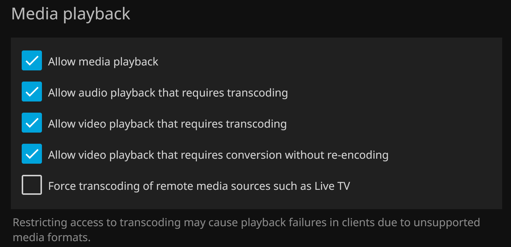 Then, navigate to Dashboard -> Transcoding and enable transcoding, if your server supports it.