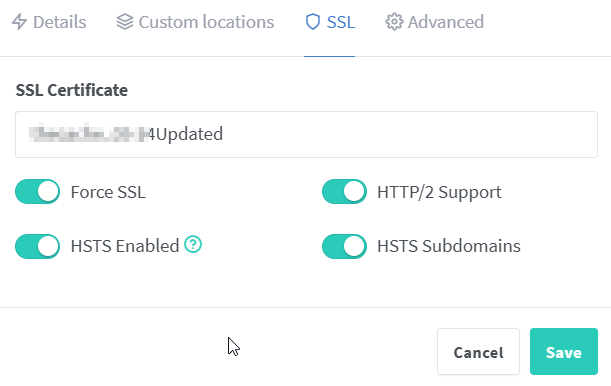 SSL: Loaded my custom SSL Cert that I use on all my other domain names.