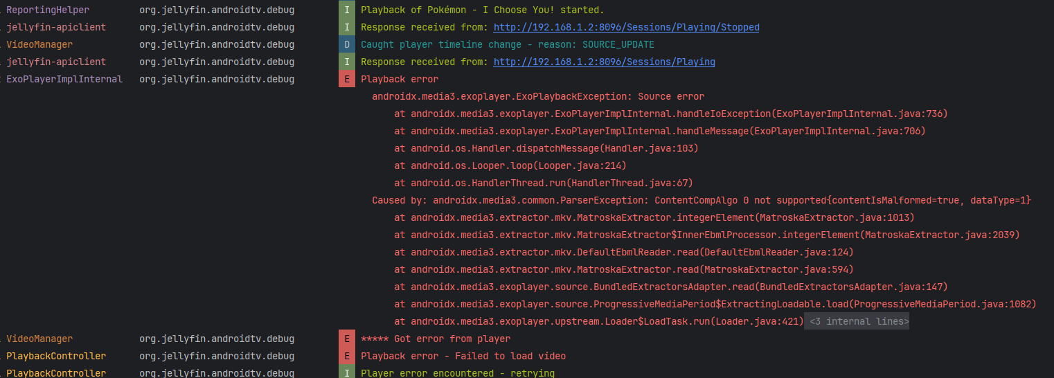 I have been having an issue with the Android TV Jellyfin application running on an Nvidia Shield Pro where one specific show series, I cannot get any episodes to play with Android TV. I am able to play other content, including other HEVC content, that are not part of the Pokemon (1997) series.