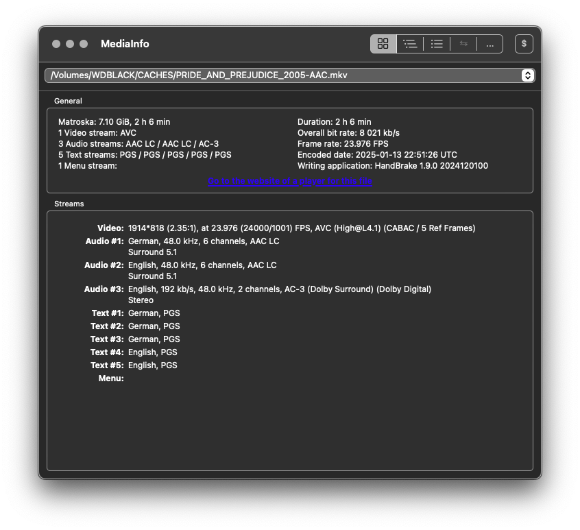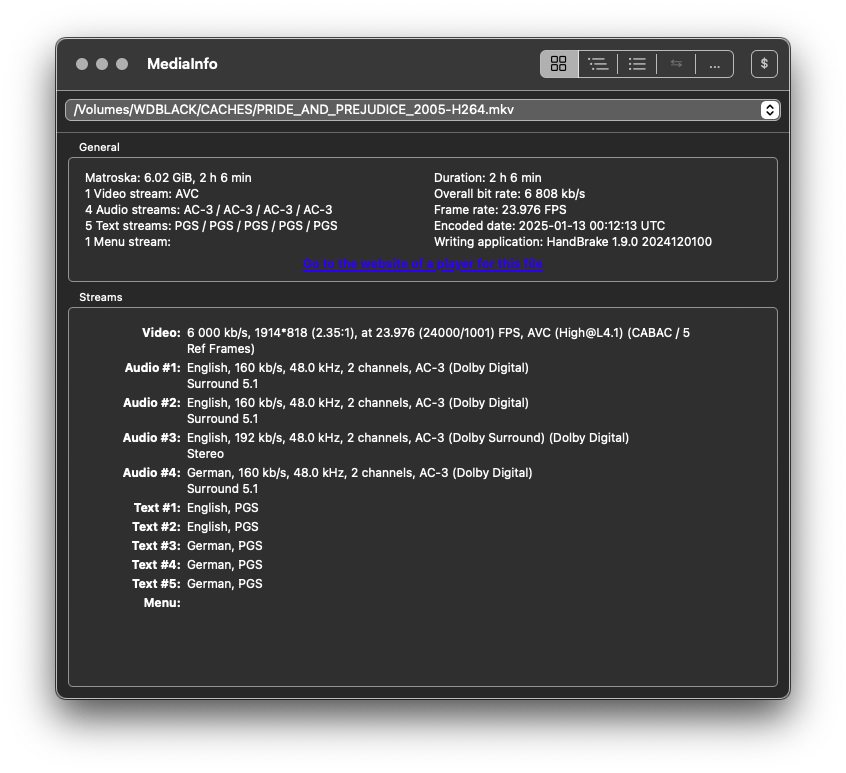 Complete name : /Volumes/WDBLACK/CACHES/PRIDE_AND_PREJUDICE_2005-standard265NoAudioNoSubtitles.mkv