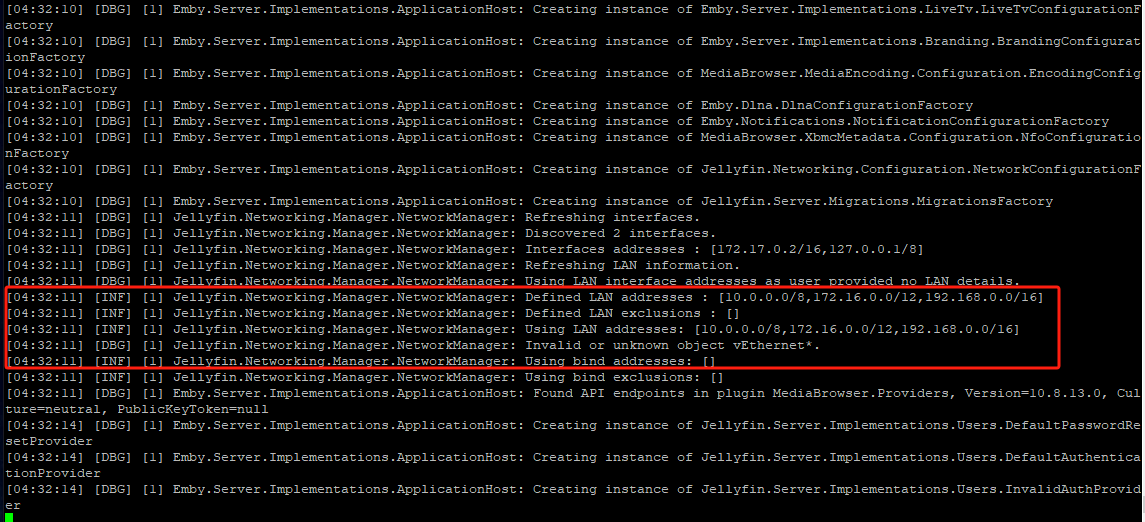 The first issue is that the Jellyfin container takes a considerable amount of time, around 10-20 minutes, to start up and allow access to the web page. In contrast, the Emby container with the same media library only takes about a minute. I checked the Jellyfin logs and noticed that it always seems to pause at a specific point during startup for a long time before it continues to log output. I've captured a screenshot at this stage to share with you all, hoping someone can help me understand what's happening during this time. What could be causing this delay, and is there an effective way to speed up the process so that Jellyfin can reach the home page as quickly as Emby does?
