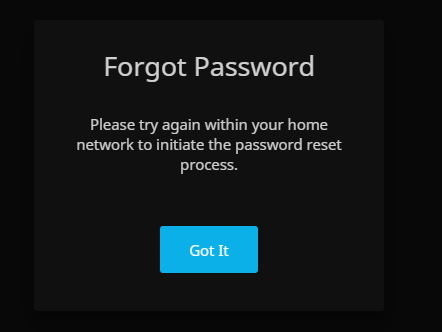 I'm running version 10.8.10-1 on a Raspberry Pi installed via Debian repository. After updating from 10.7.7-1 to the latest version, I am being asked to log in again (using both the Android smartphone app and entering the IP address in my browser on my laptop). The username/password combo saved in my password manager is incorrect, so I click on Forgot Password, but when I enter my username, I get an error saying "Please try again within your home network to initiate the password reset process." I know I am on my home network because switching to both the guest WiFi and my 5G network on my phone, the Jellyfin server can't even be found. I am expecting to see a popup saying to navigate to a folder on my server with a temporary PIN to reset my password.