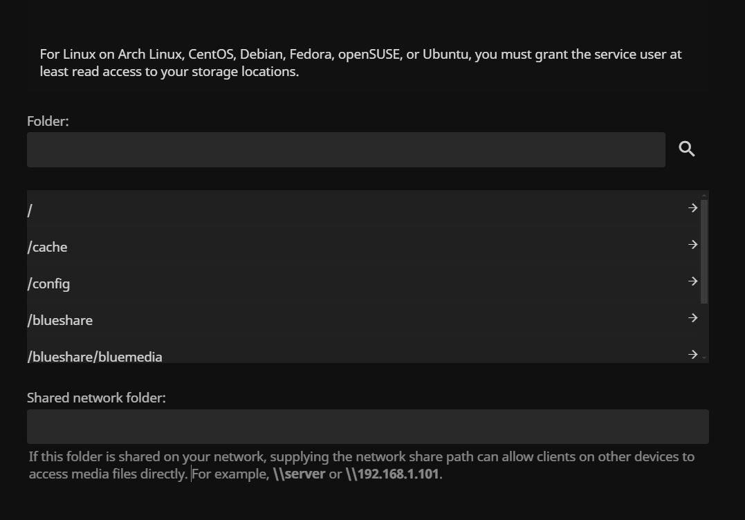 Quote:Shared network folder: If this folder is shared on your network, supplying the network share path can allow clients on other devices to access media files directly. For example, \\server or \\192.168.1.101.