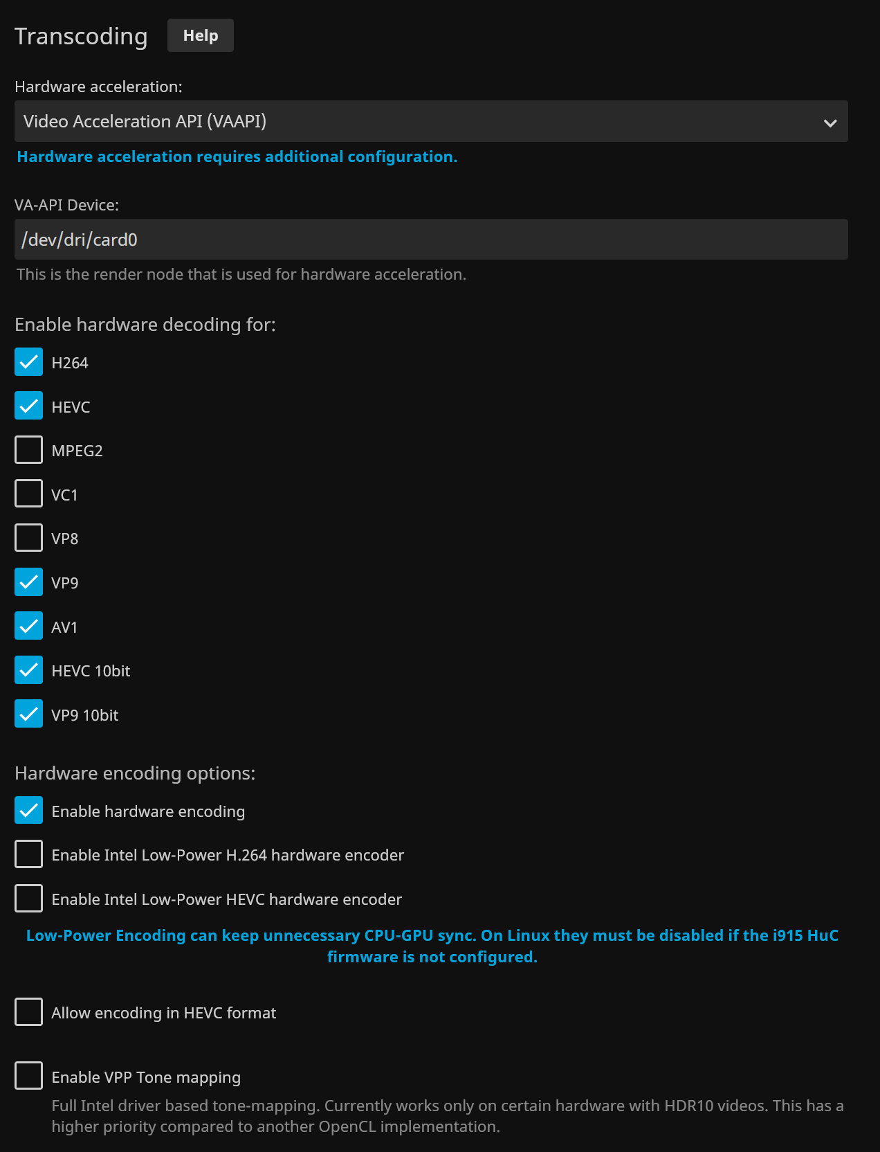 restart: unless-stoppedWith this configuration, Jellyfish runs perfect. I can use it with software encoding, it functions great. But things get really confusing when I enable VAAPI. My playback settings after I enable VAAPI: