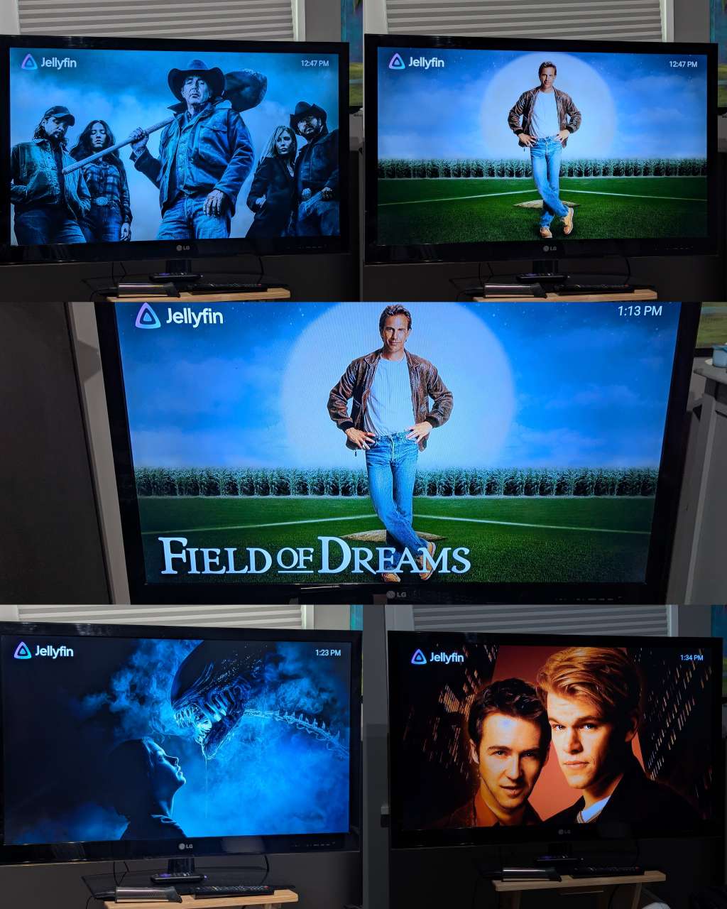 In the following image, the top row is the screensaver running on 0.18.2, and you can see that the title logos are missing from the screensaver for both the movie Field of Dreams and the show Yellowstone. The middle image is Field of Dreams again, this time with the screensaver running on 0.17.9, and now the title logo is displayed properly. And again, I ran the screensaver for several hours on 0.17.9 with no issues. The bottom row is after re-installing 0.18.2, which results in the missing logos problem starting right back up again.