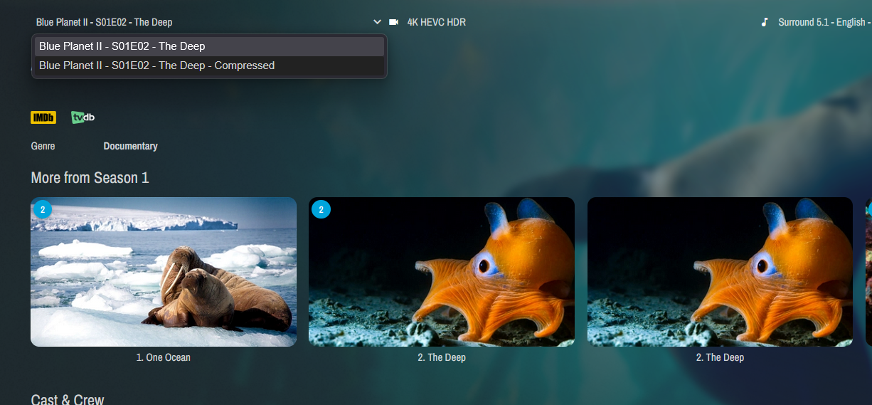 I've been using jellyfin native naming for merging movies, but for TV shows i've been using merge versions, I only keep multiple versions of TV shows for documentaries because my internet is not fast enough to serve 4k without compressing (AUS so its 1gb down 50mb up, stupid tbh). It has been working flawlessly until now, for Blue Planet II it has successfully merged every episode but ep 2,4,6,7 also have a duplicate episode and its a 50/50 whether the duplicate is the compressed or uncompressed version. I know merge versions is not officially supported, just wondering if anyone else has had a similar problem before and knows a solution, i have tried refreshing/replacing the metadata and deleting the metadata and re-scanning as well a a whole library metadata refresh but to no avail.