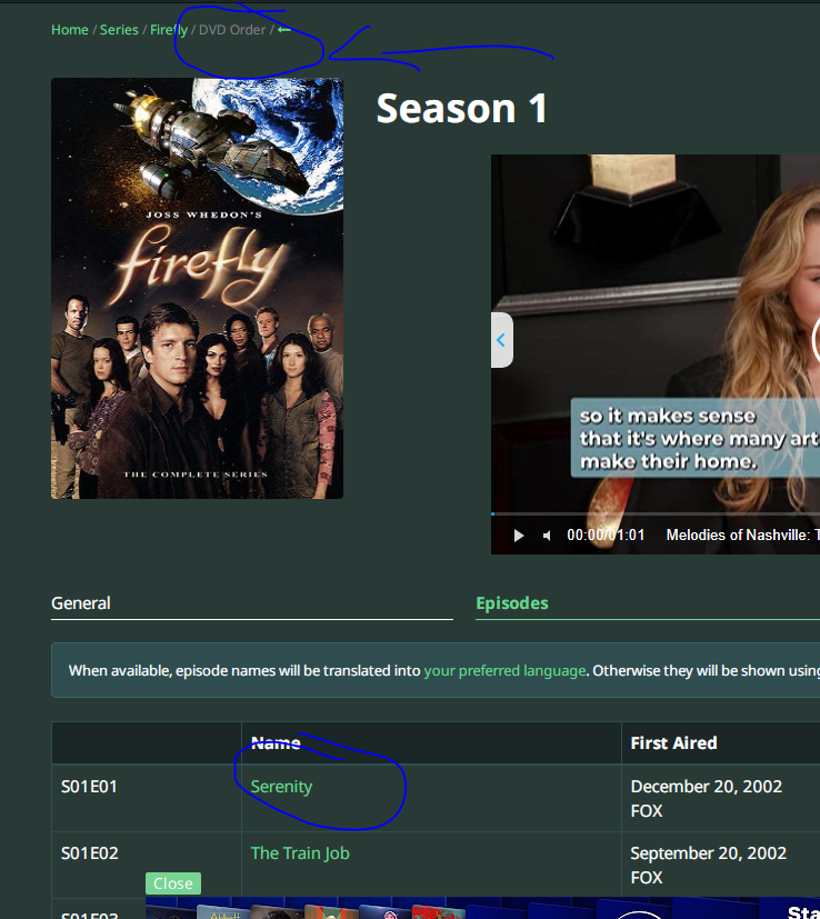 I'm having a problem with Jellyfin reading the file labeling of Firefly TV series incorrectly. I have the files labeled as such (I think per TheTVDB):