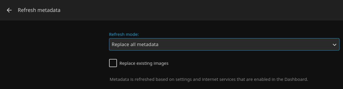 From there, you can either go to your entire library (Dashboard > Libraries) or just the series in question and refresh the metadata. For the Library route (careful if you don't have a bunch of items that need fixing), click the kebab -- three vertical dots -- and click Scan Library, choose Replace All Metadata from the drop-down, and check the box if you want new images from the sources you chose.