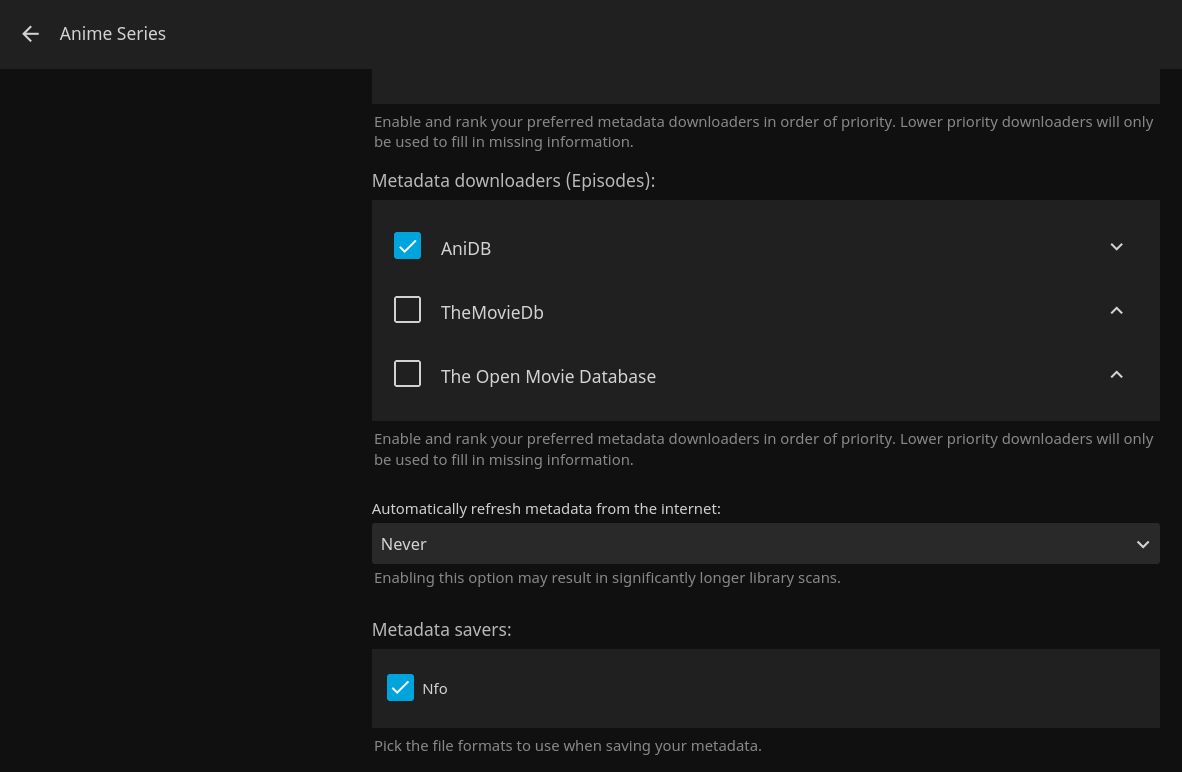 First up, I'd enable the AniDB (or your preferred anime DB plugin) via Dashboard > Plugins (you may have to go to Catalog and install it, which will require a restart). Then, go to your anime library/ies and uncheck other sources for METADATA and check only AniDB or your preferred source. You can keep other sources for image fetching, in fact, Fanart has some awesome images for series, episodes, banners, etc. Just make sure you rank them by preference. Set when you prefer for the metadata to be refreshed. I set this to never, but I want to set the metadata once and have it be done with. It will look something like this: