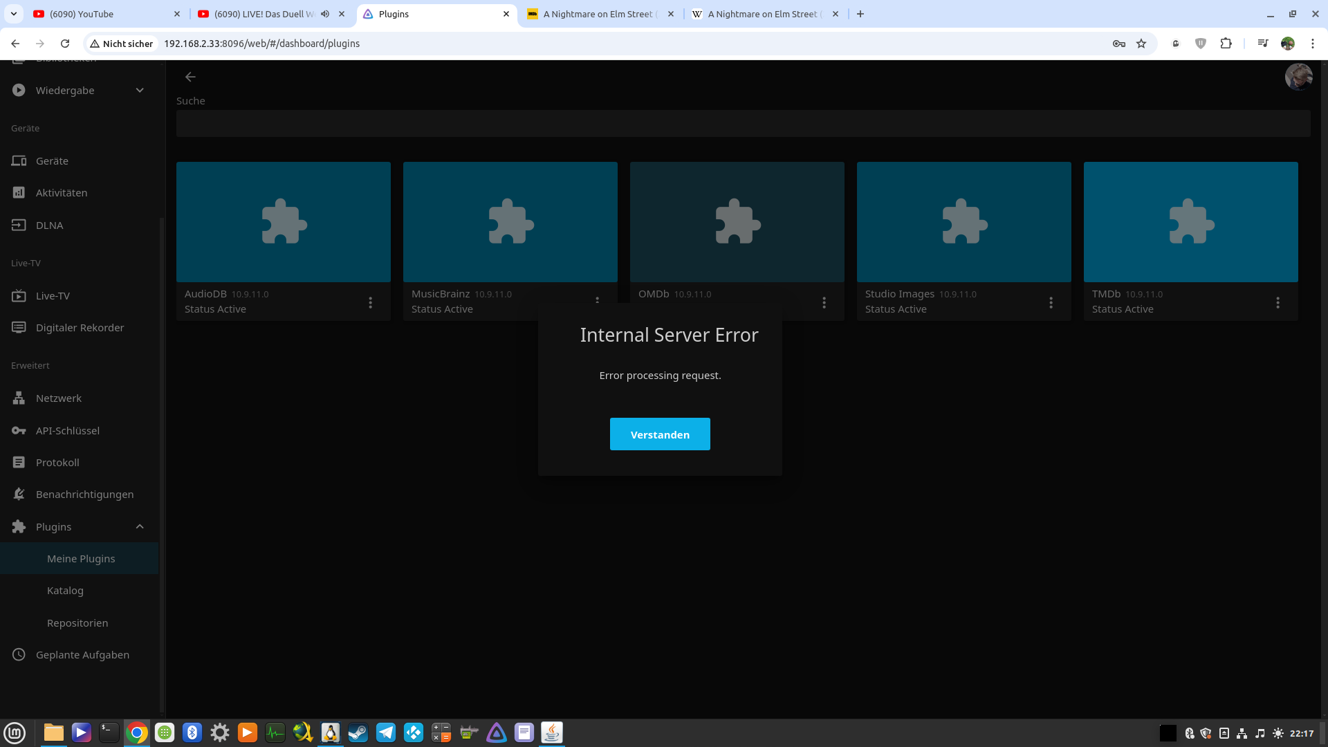Ich glaube, weil ich zuviele Plugins auf einmal deinstalliert habe, habe ich keinen Zugang zum Netz(katalog-plugin) mehr... Kennt jemand eine Möglichkeit mein jellyfin wieder mit dem internent zu verbinden? Wahrscheinlich kann ich deshalb auch keine Medien Identifizieren.. Vielleicht gibt es eine Möglichkeit mein System wieder herzustellen.