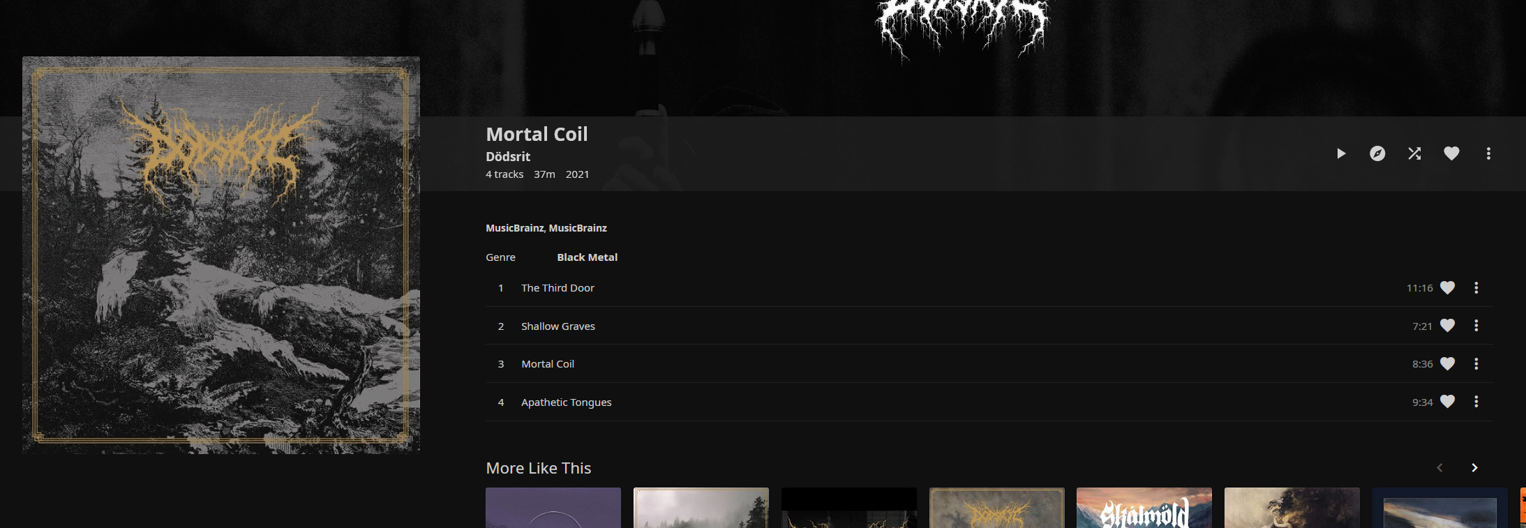 Album shows up in album list (and search) and looks fine, "More like this" also shows other albums from the same artist.