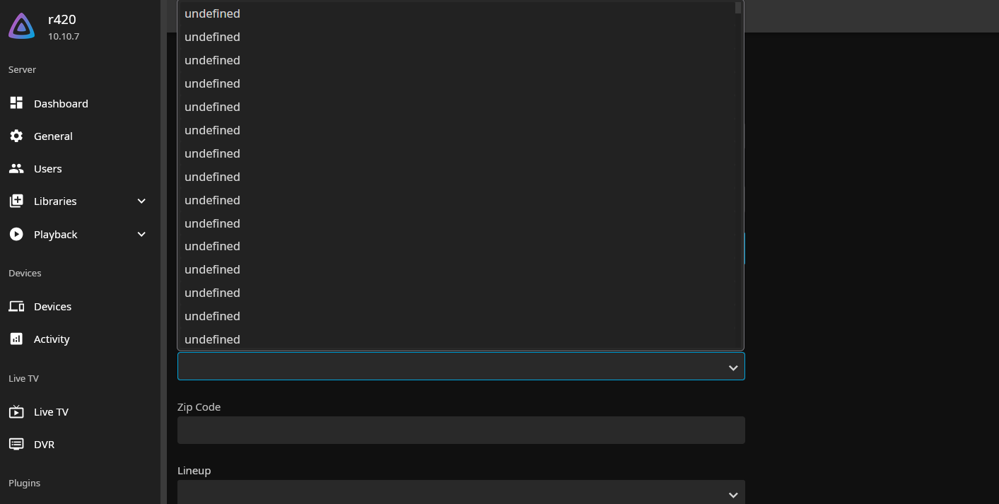 I went into the settings and and saw my region and zip code were missing. I clicked on the region drop down box and everything was 'undefined'. I restarted the Jellyfin server but got the same thing.