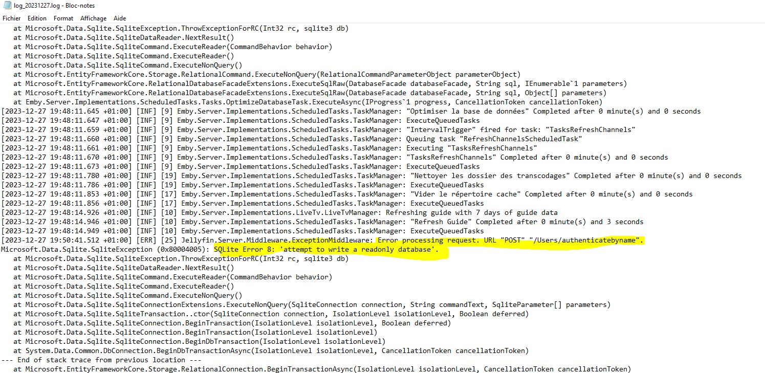 When you say you get the same outcome as @pipozor, are you saying your logs state an error happened with sqlite and a read-only database? Could you also share your Jellyfin logs with pastebin or zipping and uploading them here?