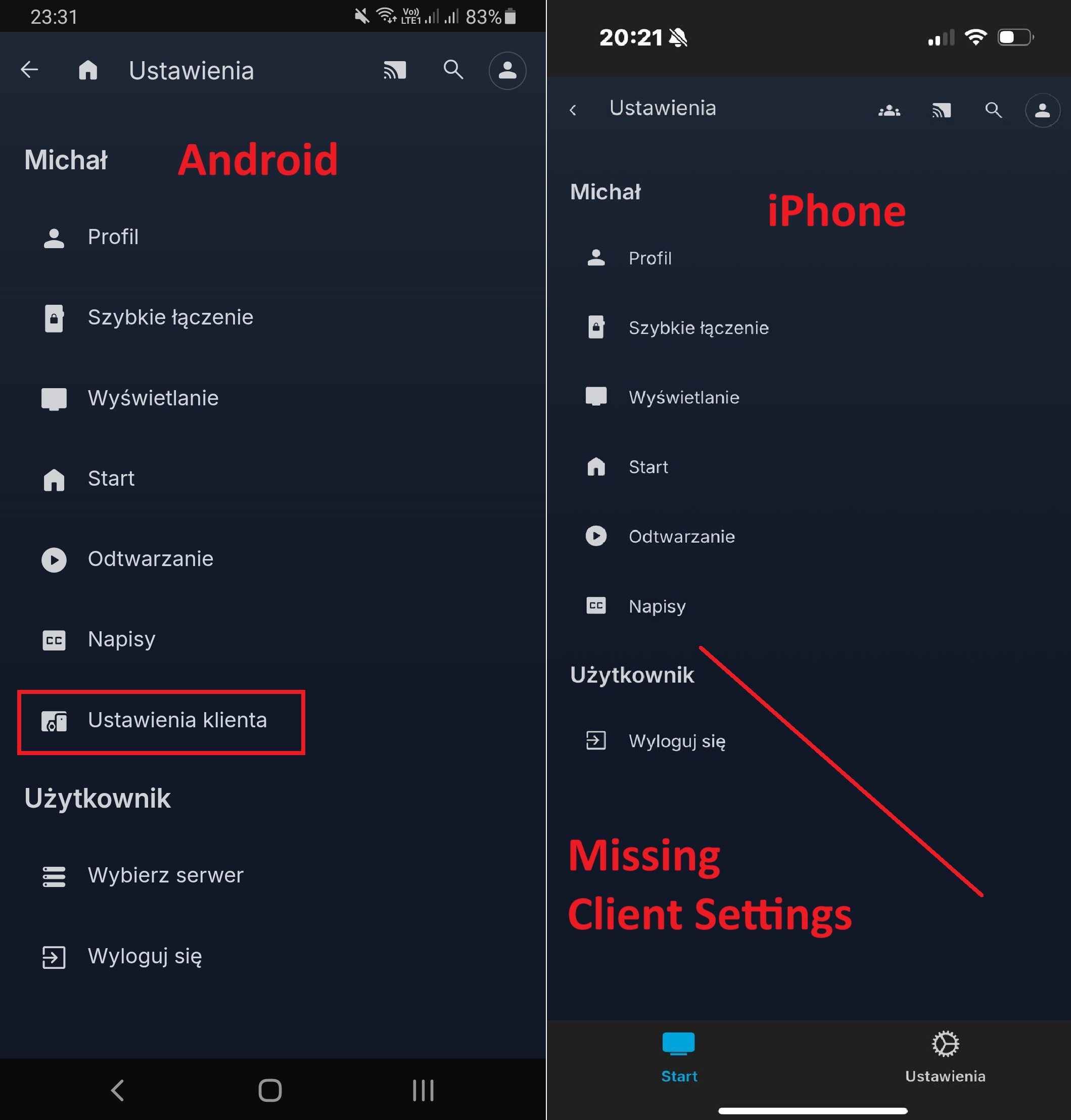 I have a iPhone and Galaxy Note and on iPhone there is a missing client settings tab. On Android everything works fine, I changed player to VLC and its perfect