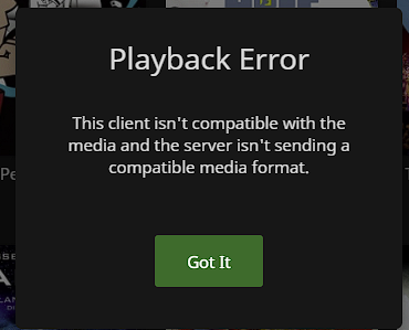Now the problem is that I now get the message "This client isn't compatible with the media and the server isn't sending a compatible media format.".