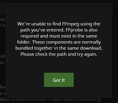 But when I try that, I get another error message that says "We're unable to find FFmpeg using the path you've entered. FFprobe is also required and must exist in the same folder. These components are normally bundled together in the same download. Please check the path and try again."