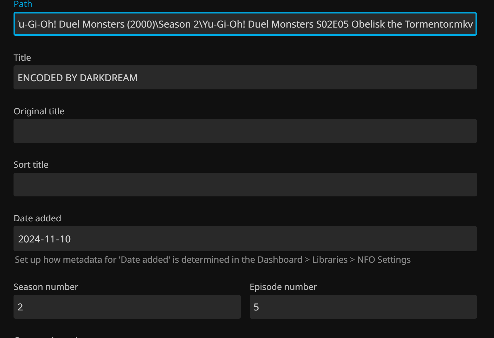 I'm pretty new to Jellyfin and have been loving it so far, but I've run into some issues with series metadata and naming. I used Sonarr to rename the episodes to the correct format: (seris name) S01E02 (episode name), but I'm having touble with it populating for most of my series. For south park I get random episodes that got their name changed to a soccer/football series, and for yugioh all my episode titles are encoded by darkdream - which I can't find anything by darkdream in the file's properties. Does anyone have some advice on how to fix this? I would love to find out where I'm going wrong Here are some photos of the file names and and such:
