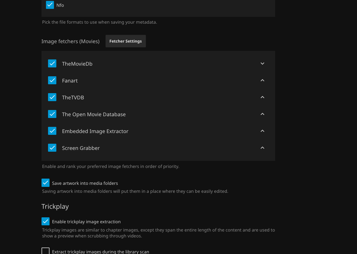 - Installed Plugins: AudioDB, Chapter Segments, Fanart, Intro Skipper, Kodi Sync Queue, MusicBrainz, OMDb, Open Subtitles, Studio Images, Tmdb, TMDb Box Sets, The TVDB, Transcode Killer