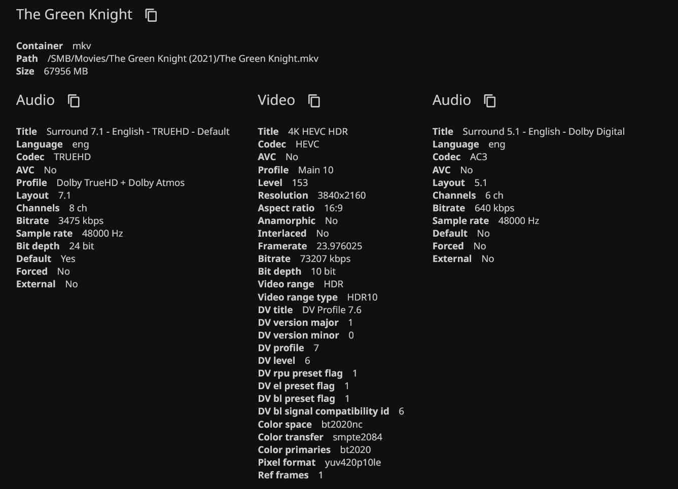 - One 4K HDR file, The Green Knight, displays a black screen while streaming on the Fire Stick, but the audio continues to play. The video player interface completely disappears while this happens. The Jellyfin dashboard says it's direct streaming.