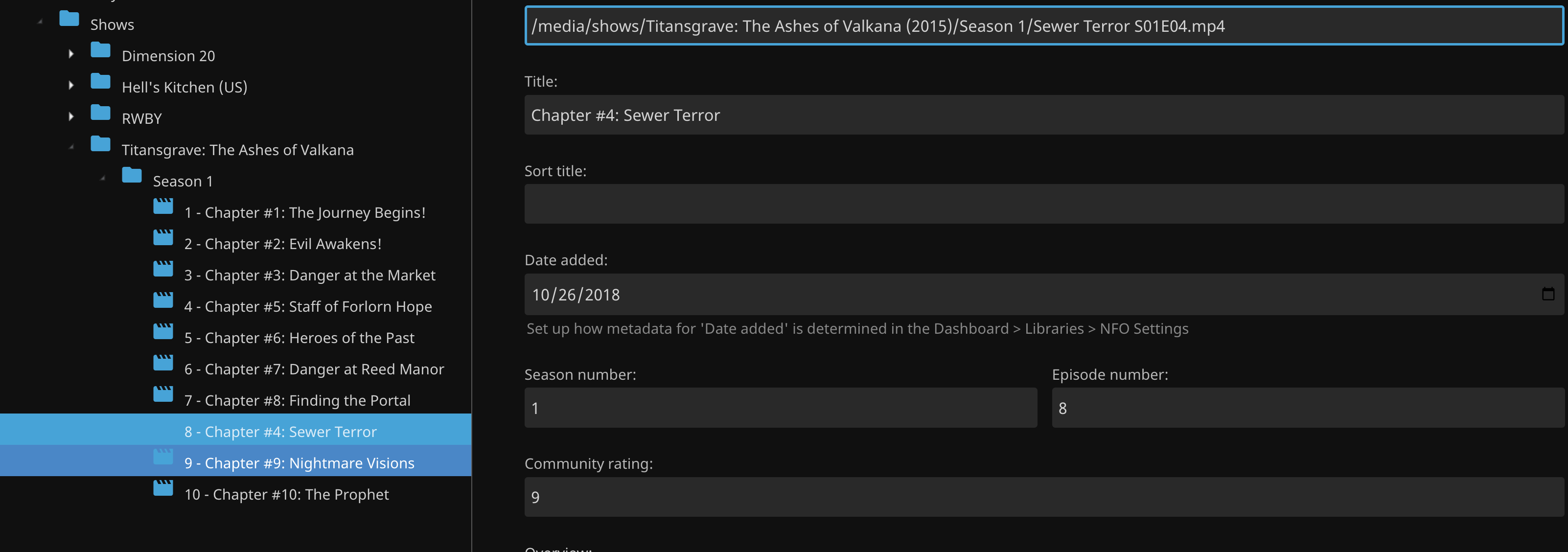 I am running Jellyfin Version: 10.8.10 in a Docker container. I have recently added new shows to my media and while all the episodes are added to Jellyfin some will be miss labeled. An episode with the file name 'SomeTitle S01E01.mp4' in Jellyfin will be given the metadata of Season 10 Episode 3. I have tried manually changing the episode numbers, and locking the metadata for an episode but they updated and given the wrong information again.