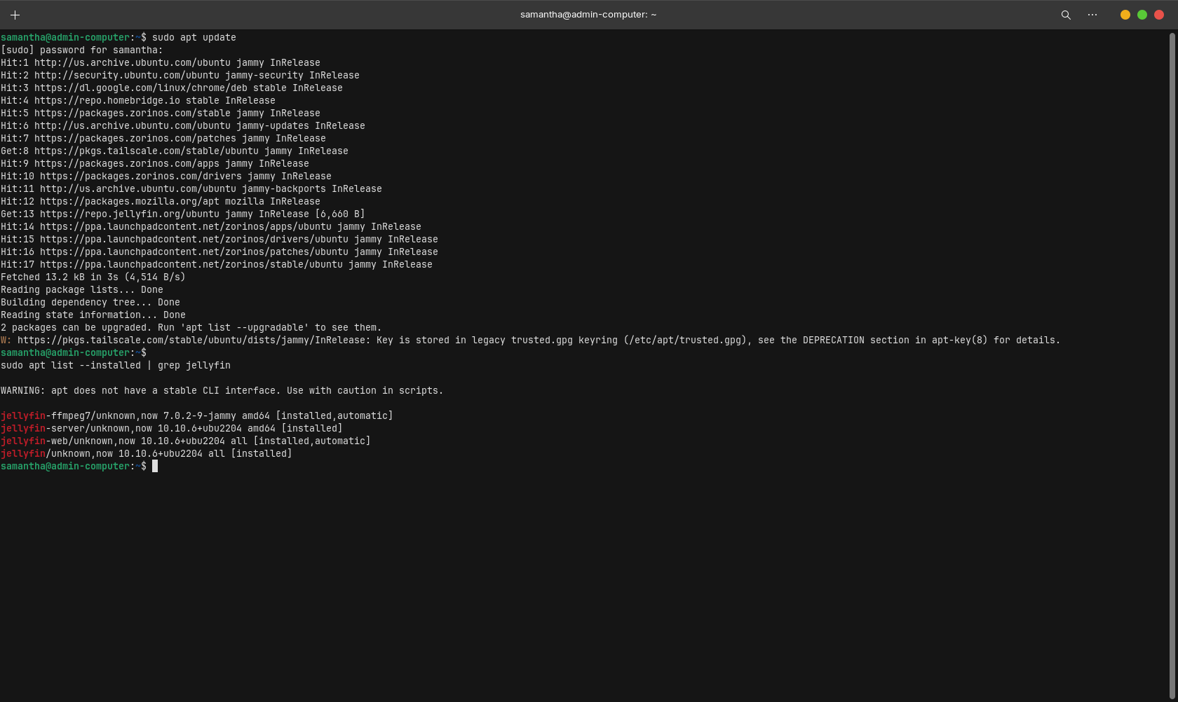 sudo apt install jellyfin jellyfin-web jellyfin-server jellyfin-ffmpeg