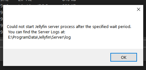 When I first set up my Jellyfin server it was running well but suddenly one day it would open at startup. it only says "Could not start Jellyfin server after the specified wait period" and then refers me to a log file that says this: