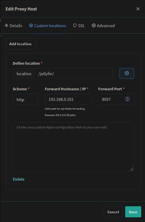 I just get a blank white page. My other service (CasaOS) works just fine, so it shouldn't be a port forwarding/DNS/firewall issue. I can also access Jellyfin just fine on my local network using the local ip, port and subpath. I've checked my jellyfin and nginx error logs and found nothing.