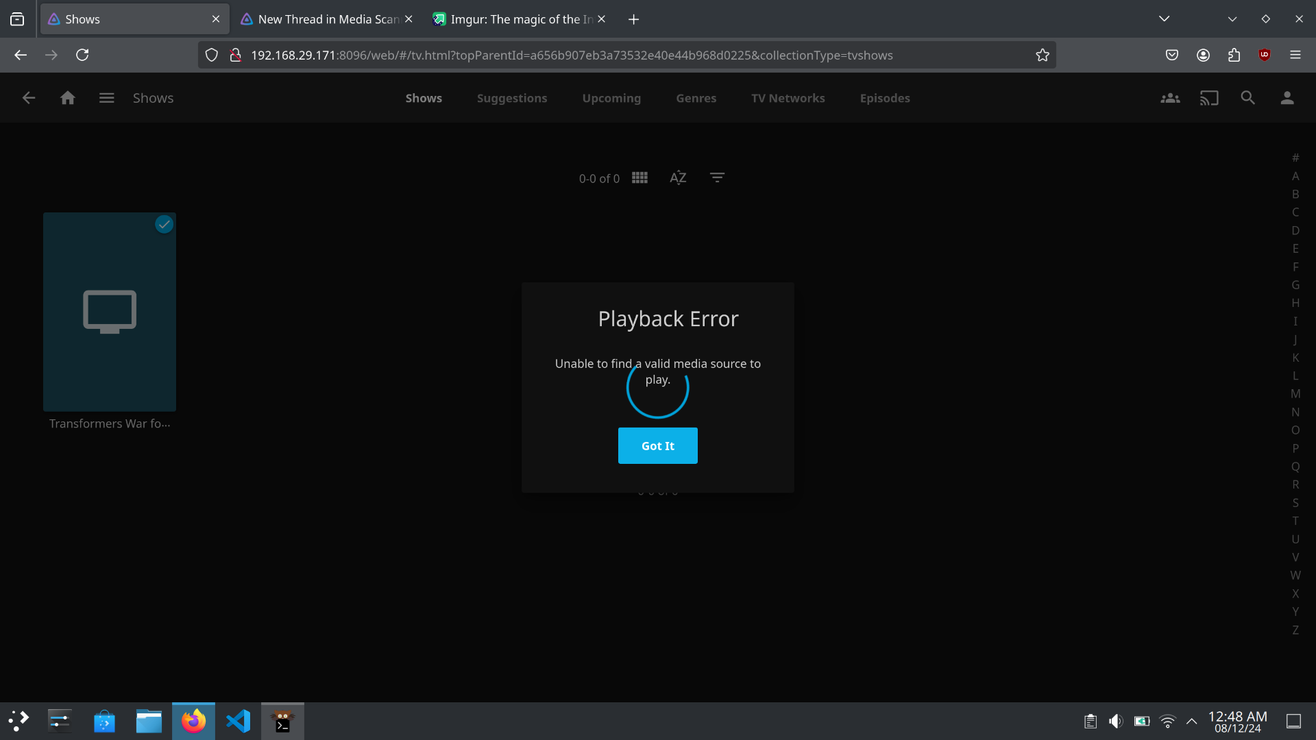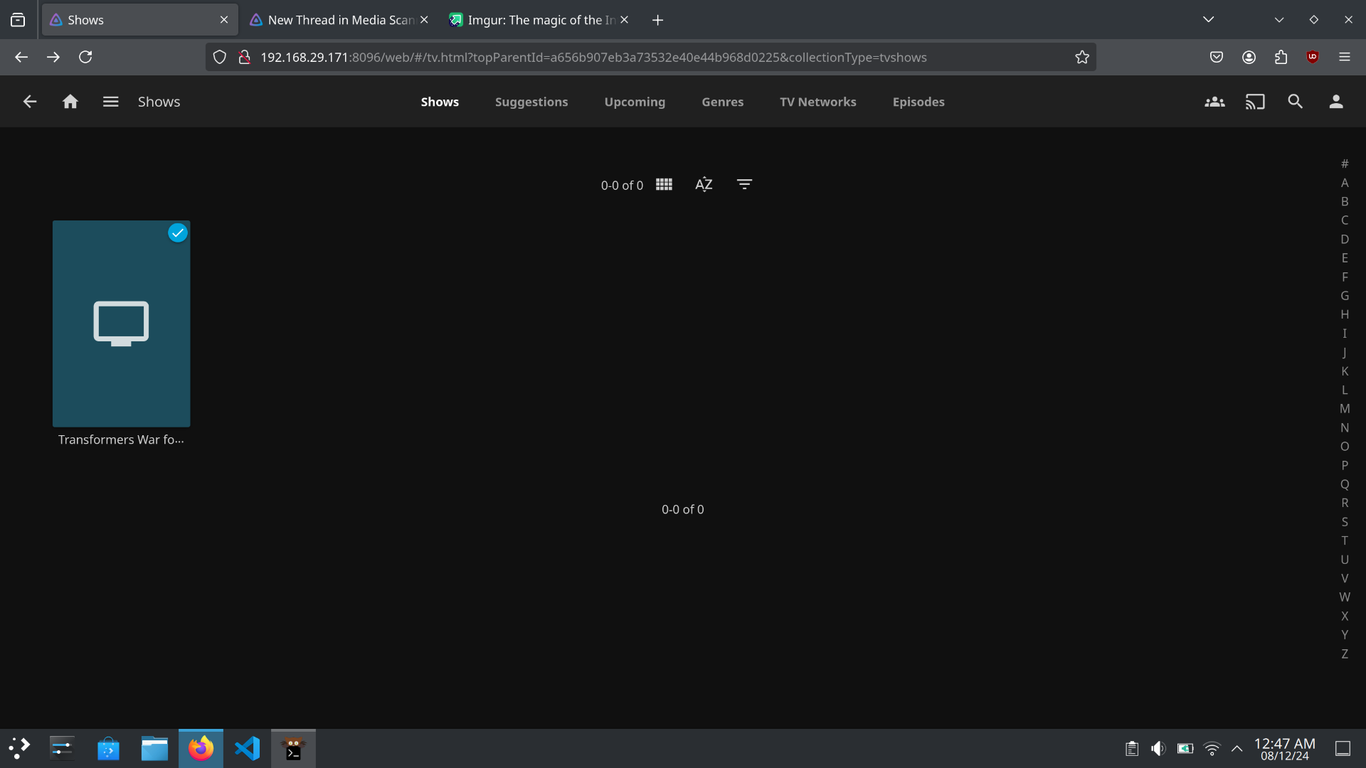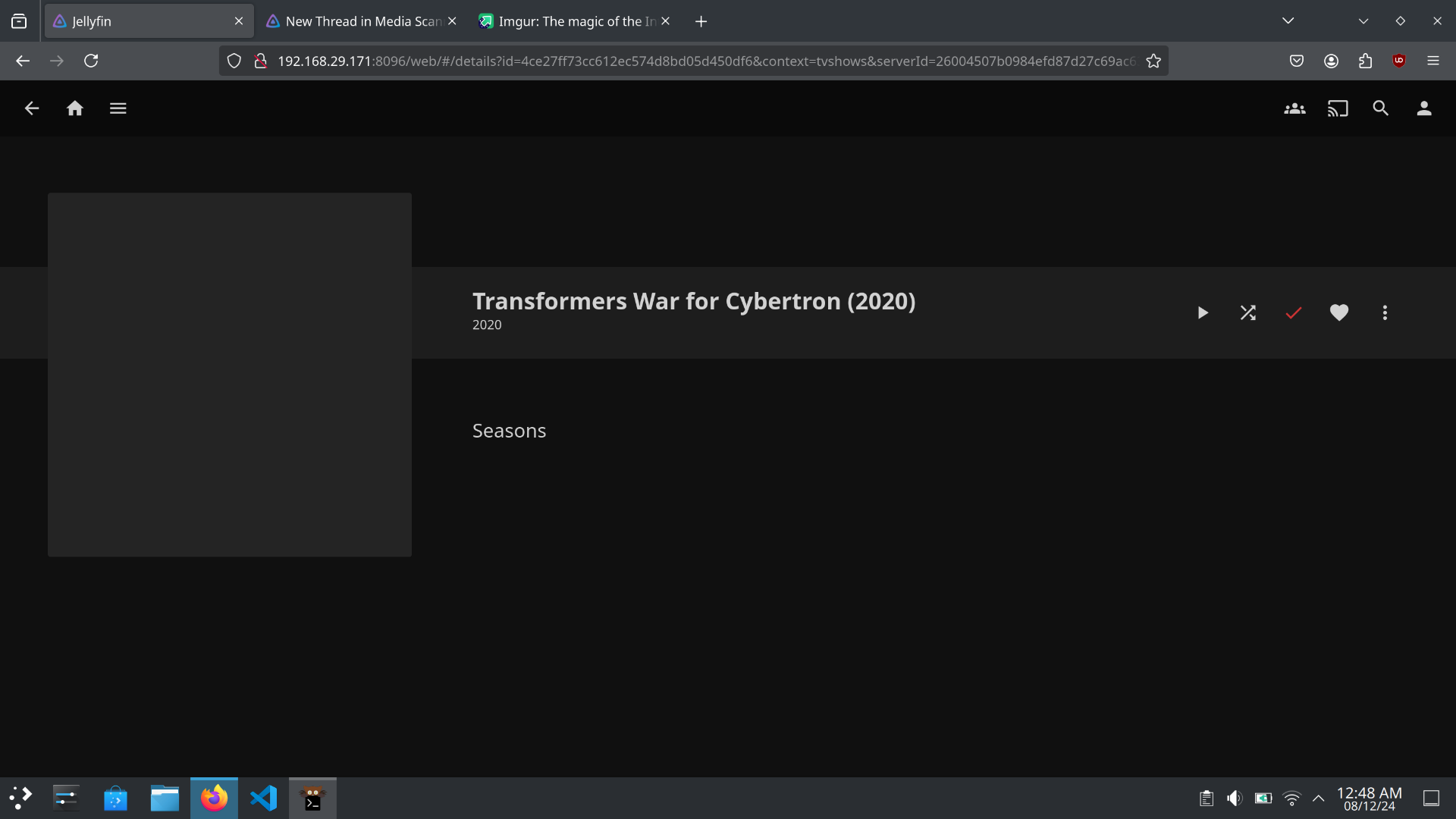 └── Transformers War for Cybertron S02E06.mkvJellyfin only shows S01E05, only that, It cannot even recognize the multiple seasons and episodes in it, also, I added the /media/shows folder when adding to library, the folder that contains the aforementioned directory structure.