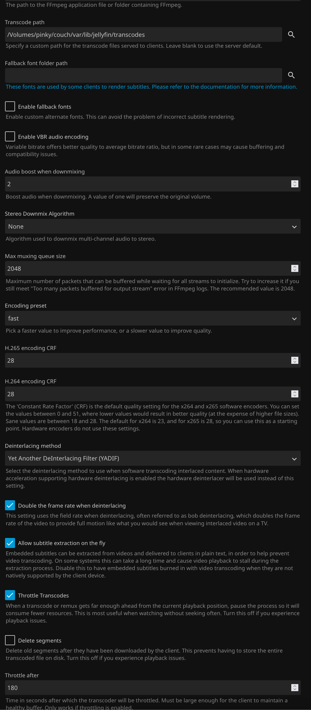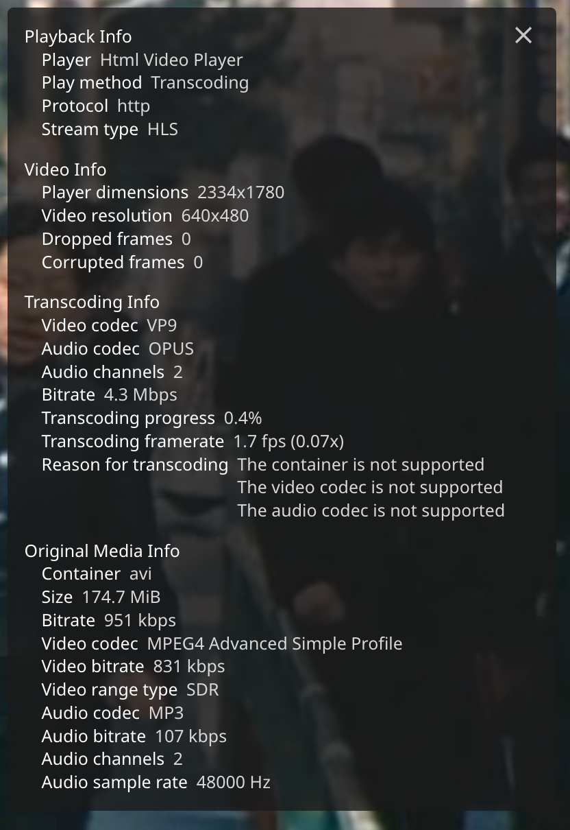 Transcoding settings enable hardware decoding for everything. Hardware encoding is enabled. Under Encoding format options, I have only selected "Allow encoding in HEVC format". Still, in Chromium, playback will start after a short delay and then constantly stutter. Playback Info reveals that it's transcoding to VP9 and OPUS, for some reason, at 0.79x.
