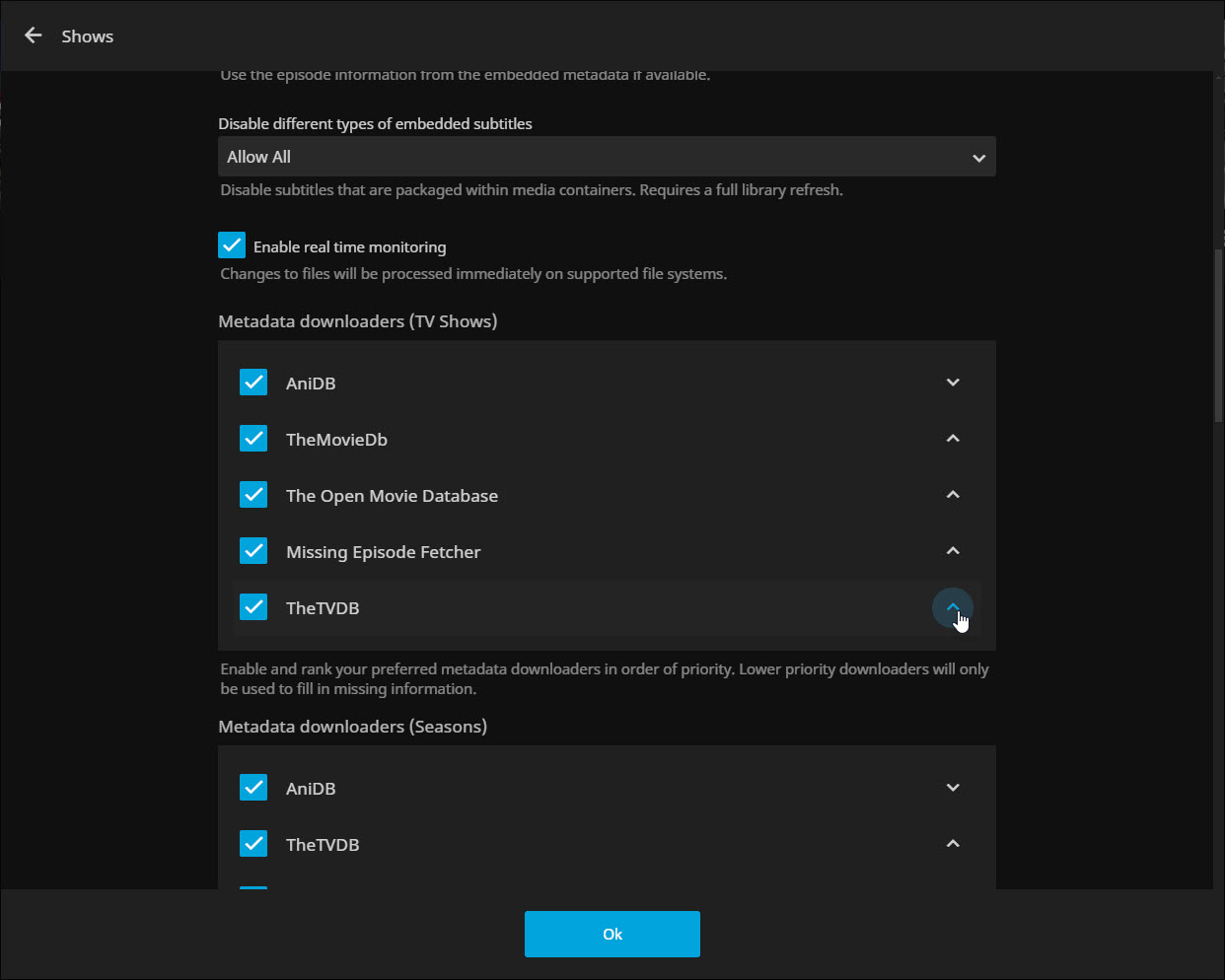 I'm having issues with The Office being identified as some other show despite putting the official TVDB id in the folder, i.e., "The Office [tvdbid-73244]." I'm pretty sure it's because TVDB is down at the bottom of the list of priority metadata downloaders, however, I am unable to move TVDB further up the list. The interface itself allows the up arrow to be selected (gradient color changes hovering over the button and the tooltip "Up" is displayed), but when clicking, the entry doesn't move anywhere. Same goes for trying to move items down the list. I've tried this both in Vivaldi, Edge Chromium, and Firefox with the same result.