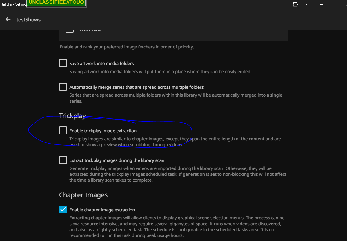 (2024-06-07, 07:06 PM)MisterMcDuck Wrote: Do you have Trickplays enabled in the library settings? Ohhy veyyy, I didn't realize it was necessary to manually enable Trickplay for each library. Thank you so much! 🙏🙏 Looks like now it's actually scanning my media and generating the Trickplay images. I'll test once the task finishes.