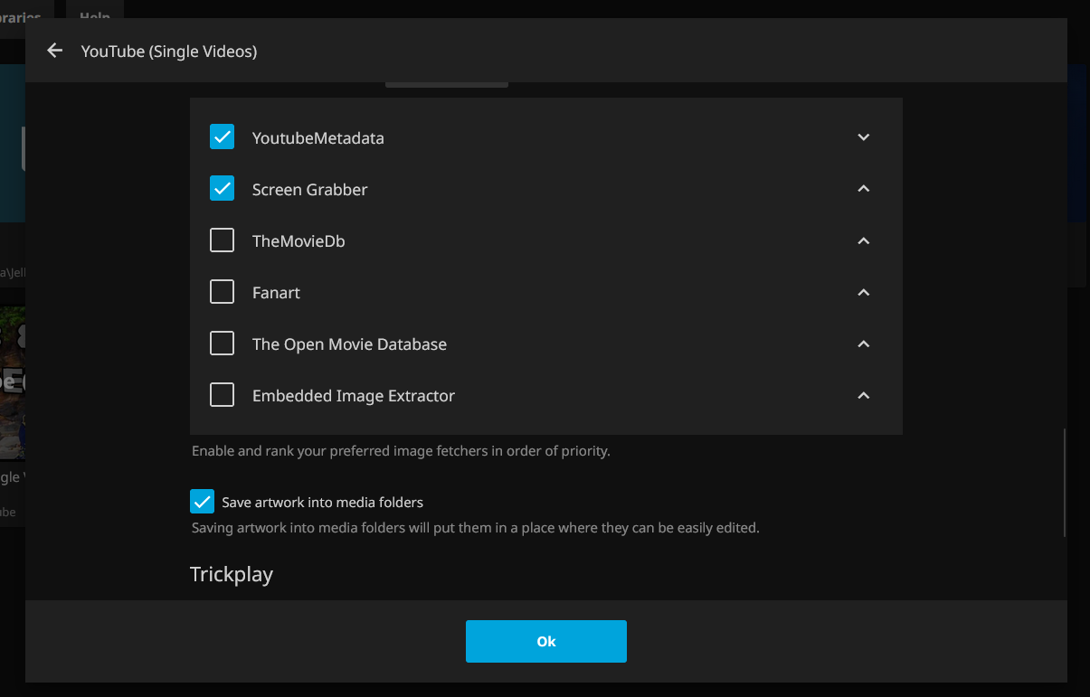 These are my current Image Fetcher settings. It's only using YouTube Metadata and Screen Grabber currently. I also have the "Save artwork into Media Folders" check box selected. Please let me know if there are additional details I can provide!