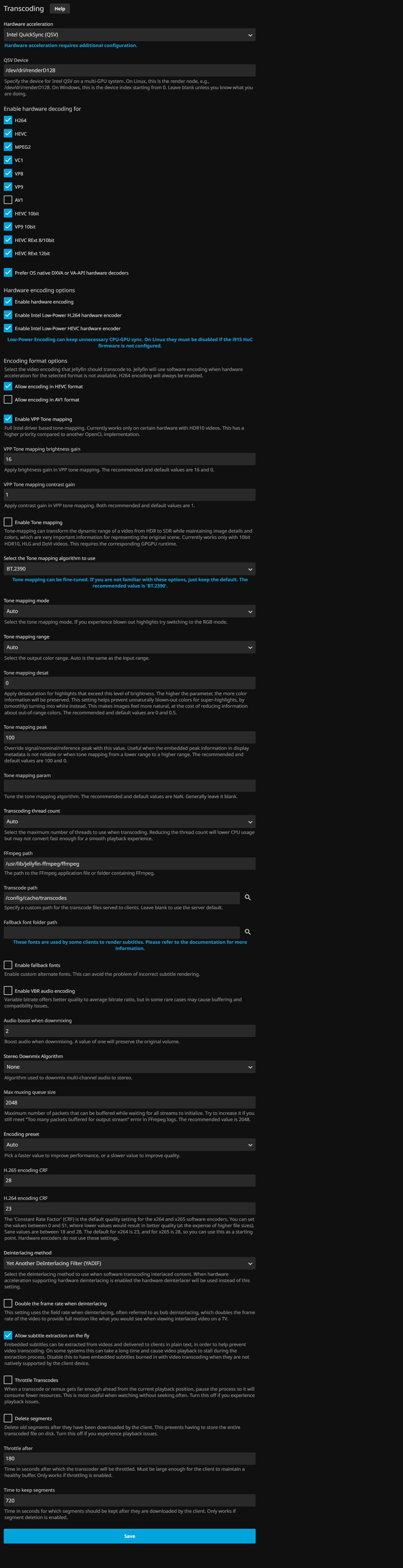 I've included a screenshot of my entire transcoding settings and a screenshot of intel-gpu-top whilst one of those movies is playing with the quality reduced to the point that it shows up as activity in intel-gpu-top.