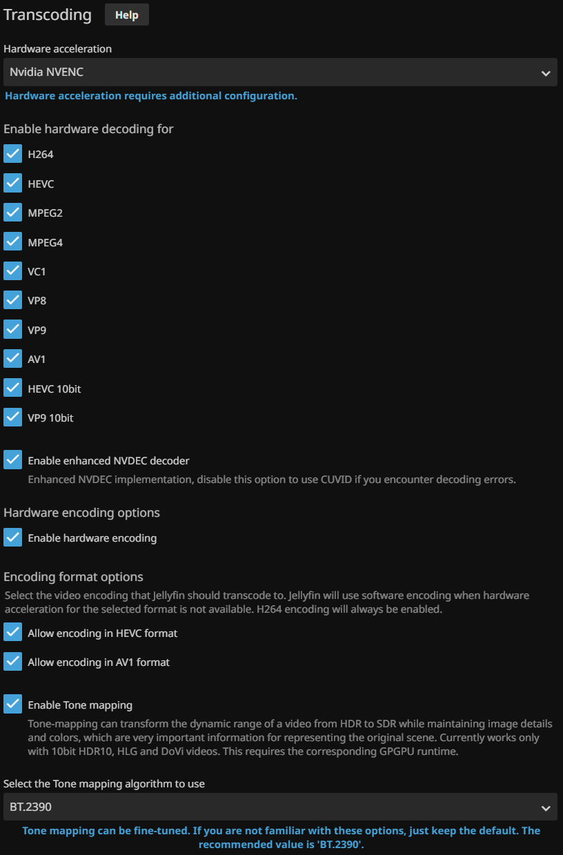 Hello, I've recently started using my Jellyfin server on my PC with specs: Ryzen 5 5600x and Nvidia RTX 3060Ti, I came across these settings called Hardware Acceleration and Encoding & Decoding, my clients are all Apple devices involving an iPhone, and iPad and a MacBook Air, my media majorly consisits of Blu-ray remuxes with Dolby Vison (DV) all in HEVC/H.265 format!