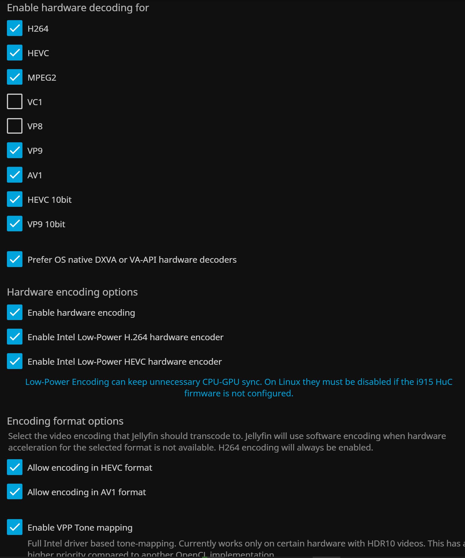 After reading a lot of documentation on hardware transcoding, I'm wondering if I have my A310 setup correctly. This is my first "homelab project" for video files and transcoding. I'm sure there are a handful of Ubuntu cli commands that I could run to make sure I'm setup and working correctly. Not sure if I know all of them. This is how I have the Jellyfin gui setup: