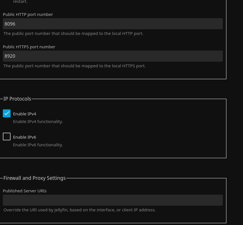 I need help setting up my Jellyfin server so I can connect to it from client apps. I'm unable to connect to it outside of the server on my computer. That includes through the internet on other devices, through amazon tv applications and the Jellyfin app on Android. I've attached some screenshots of the network configuration for my server.