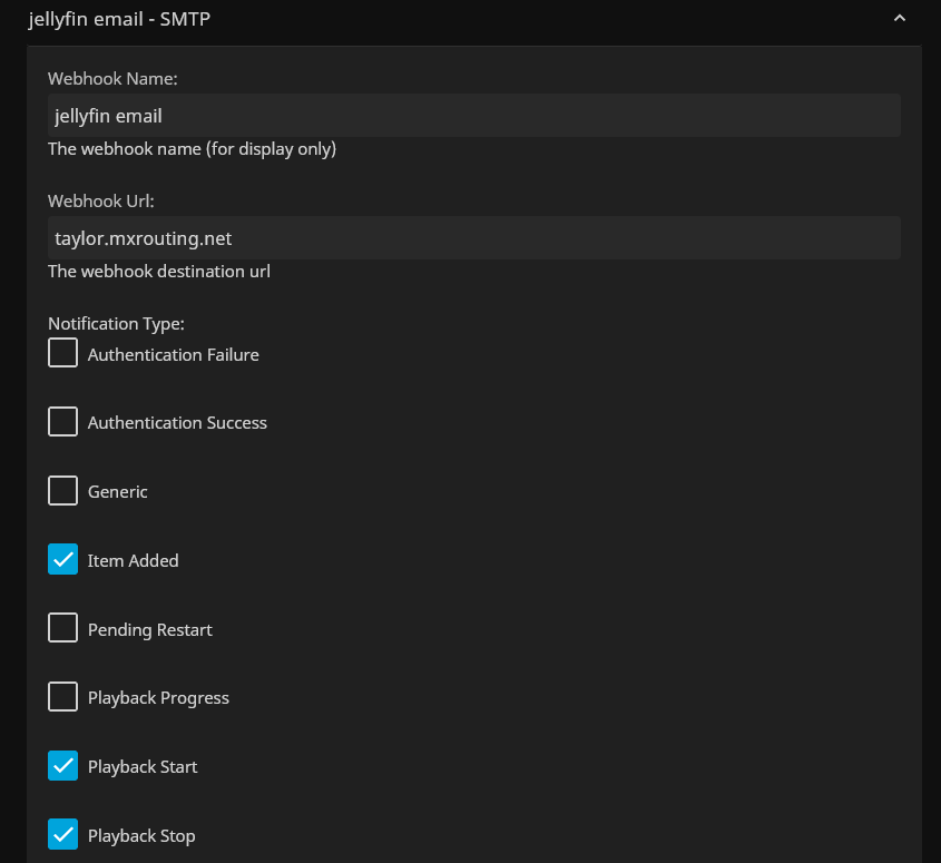 Hello I currently have issues with SMTP and webhook for Jellyfin. I currently have my SMTP server url, my email account I want to connect to webhook to send out the notification emails but it doesn't seem to be working. Below are my logs around the time of playback + screenshots of my webhook settings. What is webhook url for email?