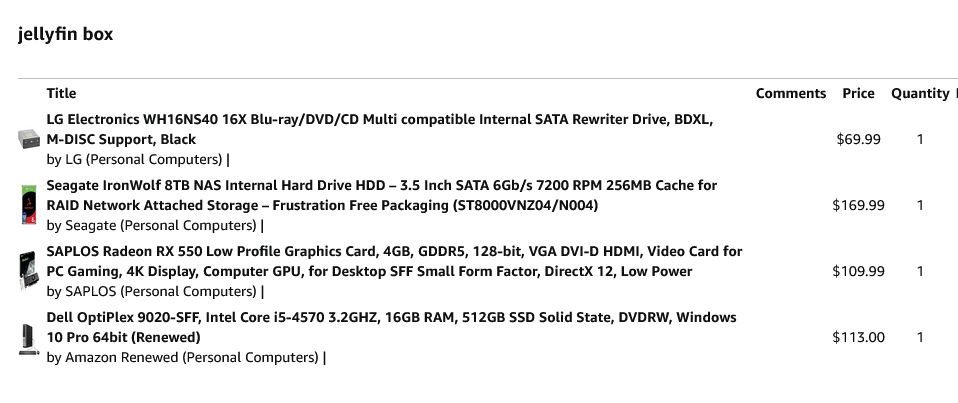 * OptiPlex 5060 Micro (i5-8500T low-power) * OptiPlex 5060 SFF (i5-8500) * OptiPlex 7060 SFF (i5-8500) All close in price to where the one you listed is, but significant performance boost as far as QuickSync transcoding goes. They won't blow anything off the map, but a 4th gen i5 is going to offer basically nothing as far as that goes. And for the RX550 price you have there, you could boost that a little bit to ~$150 for an Arc A380 and essentially add every codec out there (save for some older ones, like VC-1, H264 High) plus AV1 encode and decode. Be careful getting a SFF PC and a 3.5" drive. I have an OptiPlex SFF and they have no 3.5" drive bays. In fact, they essentially have a single 2.5" bay with optional additional hardware to expand that to hold two 2.5" drives. You're at a bit of a critical point in the decision-making process here -- where are you going to be storing this, what's your end goal, and what's your budget? I see a Bluray drive there, so I assume you'll be ripping your own movies, which you will likely want to encode so you'll want a capable iGPU or dGPU. Keep in mind you don't have to do everything now, but you'll likely want to plan for the present and for the future (e.g., get something with multiple 3.5" bays for HDD or other peripherals). To start with? I'd look for a box that can handle basic transcoding and ripping. If you can spare the space, you might see if there's a small ATX OptiPlex that could saddle in a dGPU of your choosing (the A380 is great if you're going with Linux) with multiple free drive bays and enough SATA connections for what you hope to do. The drive you picked out is definitely good, though you don't need high speed for any of what will be going on so you might be able to save a bit on that front if you keep an eye out. EDIT: Forgot links... Micro: https://www.amazon.com/Dell-OptiPlex-Com...B07M9WB5J5 7060: https://www.amazon.com/Dell-Optiplex-i5-...B07HZ3SR3T 5060: https://www.amazon.com/Dell-OptiPlex-i5-...B09X63S6Z9